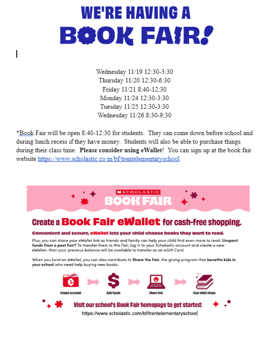 It is hard to believe it is November already. With that, it means it is Fall conference time and Turkey Bingo is coming up. Please be sure and schedule a time with your child's teacher to meet about all the amazing things that students here are Trent are learning. It is our goal to meet with every child's family. Please help us to meet that goal.