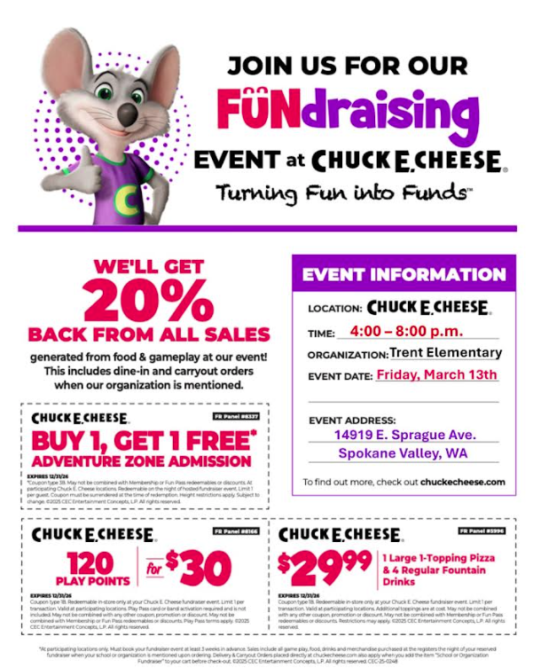 - Chuck E Cheese Night March 13th 4:00-6